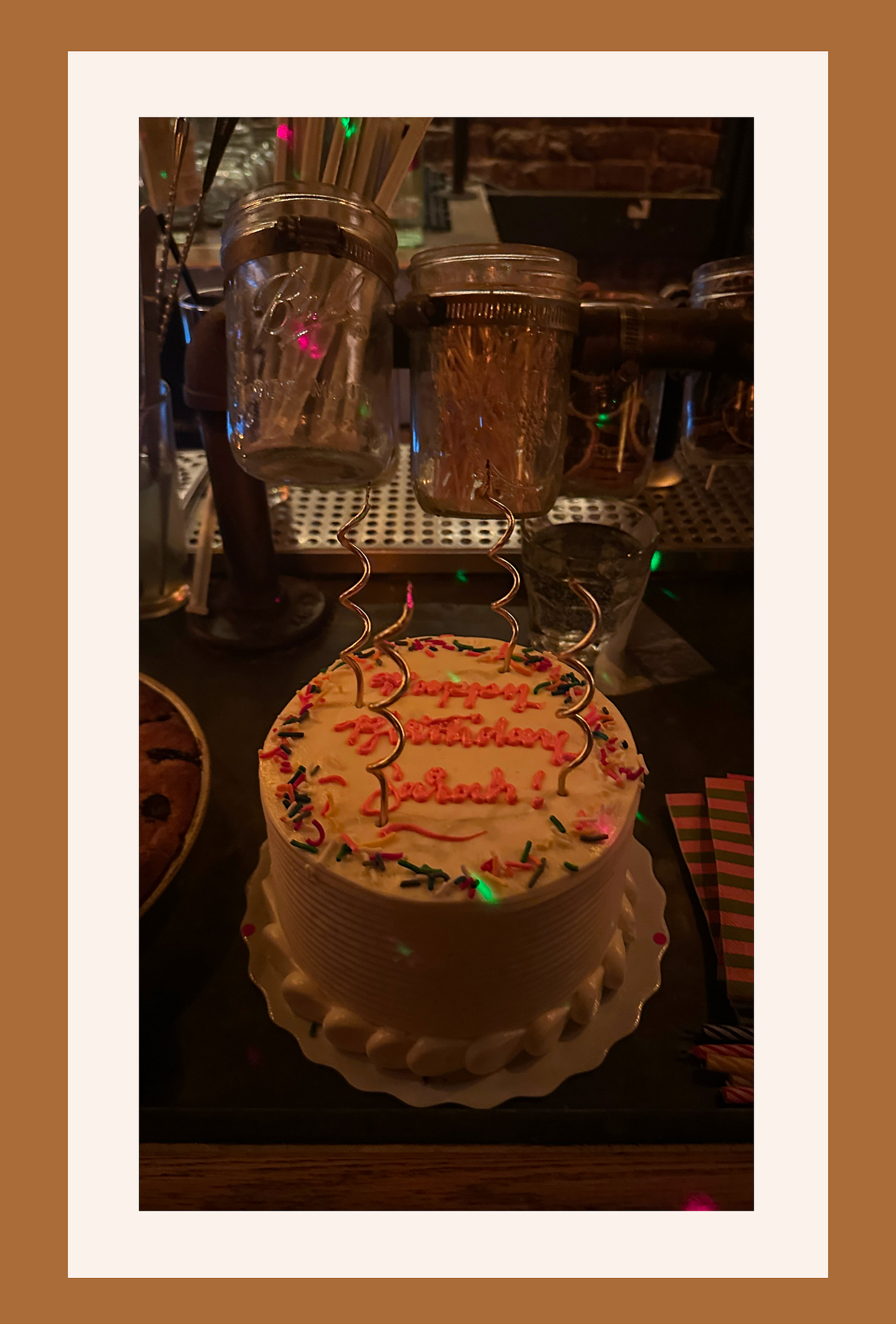 texts that continued throughout the day, from friends old and new, from coworkers i hadn’t talked to in months. i opened a birthday card from my mamas, and baked my friend bruce (we share a birthday!) a berry cake for later (more on that below!). all day, i kept waiting for it to hit me. that holy shit, i’m 40 feeling. it never did. not even as i donned a sparkly top and a tinsel headband, not even as i blew out birthday candles in a bar while my friends sang at the top of their lungs. that’s not to say that i felt sad on my birthday (i was worried i would), but more just that it didn’t feel quite…real? my text messages were wonderful, a few folks on my team sent really lovely notes via e-card, i had a funfetti cake. but it all felt a bit…muted? maybe it’s because there’s so much anticipation surrounding a milestone birthday.