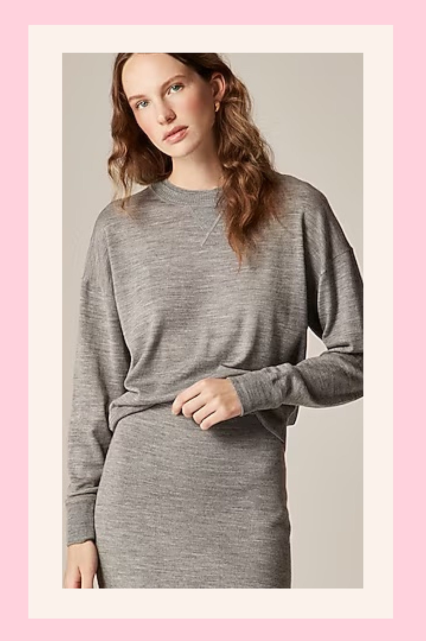 is it just me, or has j crew been killing it lately? the sweater i shared last week came, and while the color is perfect, it’s a little too oversized. if you order it, size down (i need a medium, not a large). it’s also on sale for $89.50, down from $128—a steal for a cozy knit you’ll wear all season long. you know what’s also on sale? OH SO MUCH. i know the whole j crew sale thing can get a little tired (they’re always doing sales, so much so that it feels silly to ever purchase anything there full price). but honestly? the sale right now is good. take, for example, the merino sweatshirt pictured above. it too was originally $128. right now, it’s on sale for $46. FORTY-SIX! it’s hanging out in my cart, along with a second color (the brown shade) of last week’s sweater in the correct size.